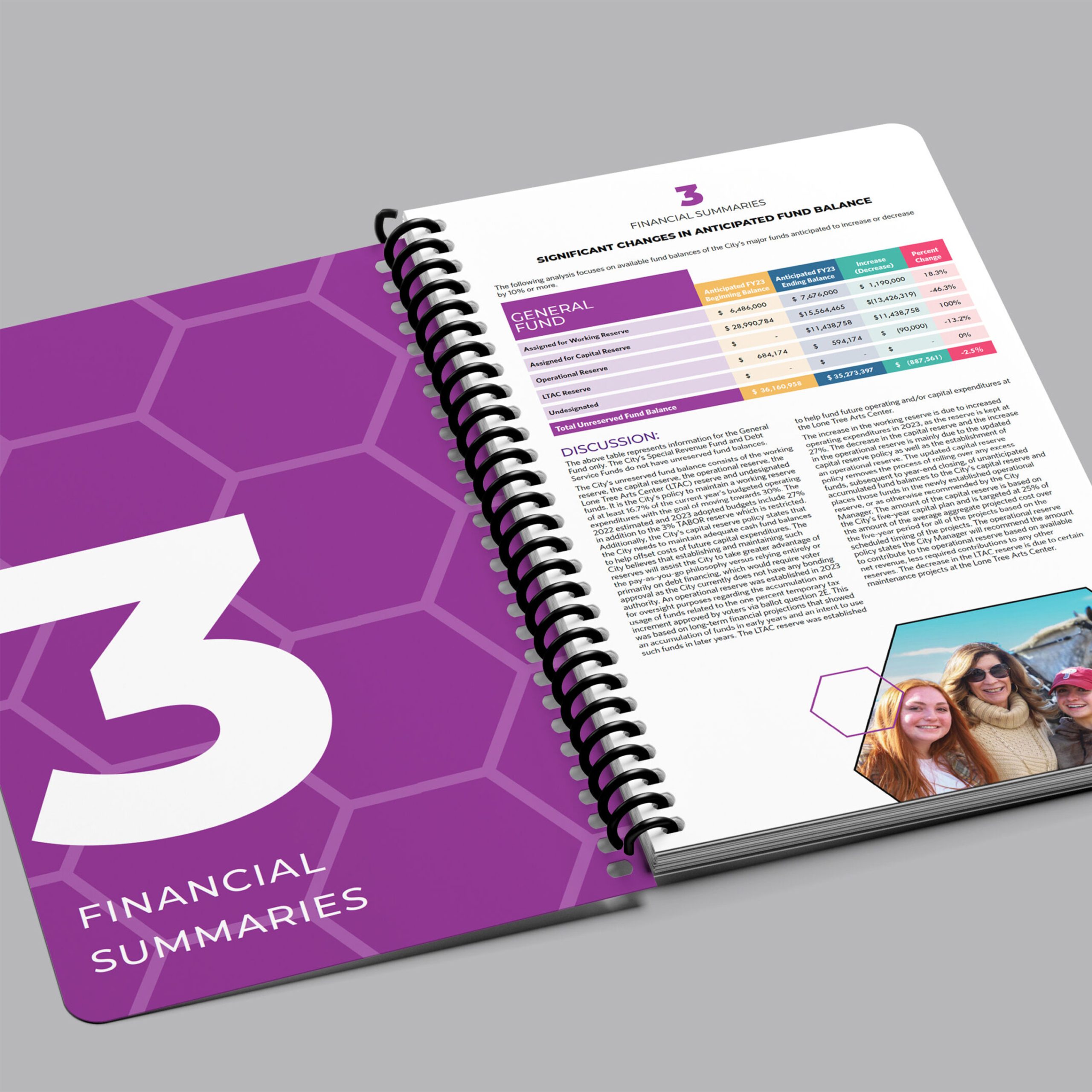 Books like these are never on the best-seller list. The information is dry and mostly not relatable for the general population. This is where having a great design to visually appeal to an audience is so important. New colors and fresh photos from the recent community events help bring vibrance and city-wide enthusiasm for the upcoming year.